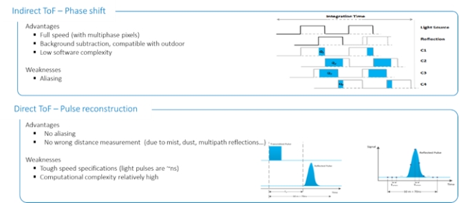 在這種不可預(yù)測的工作環(huán)境中,飛行時間系統(tǒng) (ToF) 是理想之選,因為它們具有實時3D信息獲取和決策能力,在快速場景中檢測物體或人物的能力。飛行時間技術(shù)具有兩種方法:直接飛行時間和間接飛行時間: