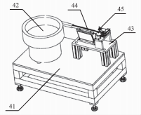 送料機(jī)構(gòu)4包括送料平臺41,送料平臺41上安裝有可震動(dòng)排序上料的料盤42及與料盤42連通的上料器43,上料器43包括料槽44,料槽44的一端連接料盤42,另一端連接送料接頭,送料接頭連通高壓空氣以及用于輸送鉚釘?shù)墓艿?送料接頭的上方設(shè)置有把鉚釘推動(dòng)送入送料接頭的滑塊。送料時(shí),料盤42把鉚釘排序并通過料槽44送到上料器43上,然后滑塊把鉚釘推落到送料接頭內(nèi),鉚釘從管道內(nèi)由高壓空氣送到鉚釘機(jī)構(gòu)32上完成上料。在送料機(jī)構(gòu)上方設(shè)置有用于檢測鉚釘位置的傳感器45,當(dāng)檢測到鉚釘時(shí),滑塊則移動(dòng)把鉚釘推落到送料接頭內(nèi)(圖3)。