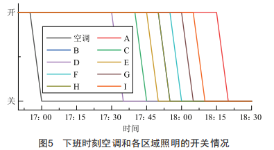 由圖可知,由于無人在系統(tǒng)中申請加班,因此空調系統(tǒng)到17:00自動關閉,而各區(qū)域的照明系統(tǒng)由于各區(qū)域人員離開時間不一致,因此實現(xiàn)了差異化控制。