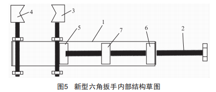 設(shè)計(jì)一種新型六角扳手(圖4),能夠?qū)崿F(xiàn)對(duì)六角形螺栓、螺釘、螺母等進(jìn)行卡緊,在擰轉(zhuǎn)過(guò)程中不易打滑,轉(zhuǎn)動(dòng)靈活。一種新型六角扳手技術(shù)方案(圖5):包括5個(gè)部分,即空心長(zhǎng)方體外殼1、長(zhǎng)型螺栓2、帶有120°內(nèi)角齒輪紋的兩個(gè)螺栓3、4及相應(yīng)螺母、凹形墊塊5。將螺栓3、螺栓4從空心長(zhǎng)方體外殼1的長(zhǎng)邊及短邊構(gòu)成的平面中插入并用螺母進(jìn)行固定,使螺栓3與螺栓4構(gòu)成該六角扳手的開(kāi)口部分,長(zhǎng)型螺栓2從空心長(zhǎng)方體外殼1的中邊及短邊構(gòu)成的平面中插入,在空心長(zhǎng)方體外殼1中置入兩個(gè)螺母,長(zhǎng)型螺栓2穿過(guò)兩個(gè)螺母,將長(zhǎng)型螺栓2前端插入凹形墊塊5的凹槽內(nèi),凹形墊塊5緊靠螺栓3,螺栓4緊靠長(zhǎng)型螺栓2插入平面的相對(duì)面,通過(guò)對(duì)長(zhǎng)型螺栓2的柄部進(jìn)行轉(zhuǎn)動(dòng)調(diào)節(jié)從而改變螺栓3的位置,配合螺栓4使扳手的開(kāi)口部分在水平方向的大小改變,實(shí)現(xiàn)對(duì)不同規(guī)格的六角形螺栓、螺母或螺釘?shù)臄Q轉(zhuǎn)。