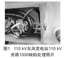 通過(guò)系統(tǒng)監(jiān)控及數(shù)據(jù)分析,發(fā)現(xiàn)2016年9月份110kV東鳳變電站110kV旁路1030代供1103期間的電流回路數(shù)據(jù)異常,且未代路期間有殘余電流,正向有功總有明顯的增量。發(fā)現(xiàn)異常后馬上發(fā)起異常工單,運(yùn)維人員現(xiàn)場(chǎng)進(jìn)行檢測(cè),發(fā)現(xiàn)接線盒面板右側(cè)固定螺絲緊挨的電纜芯外皮略有破損,通過(guò)右側(cè)固定螺絲接地,并于當(dāng)日完成故障消缺(圖1)。