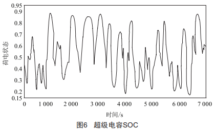 從圖3中可以看出,基于超級電容aso的功率再分配策略的功率跟蹤補償效果較好。圖4和圖5分別驗證了蓄電池主要補償?shù)皖l功率部分和超級電容主要補償高頻功率部分。從圖6中可以看出超級電容aso變化范圍為(0.15,0.95),因此能夠更充分地利用超級電容的容量。