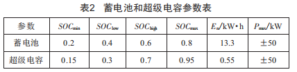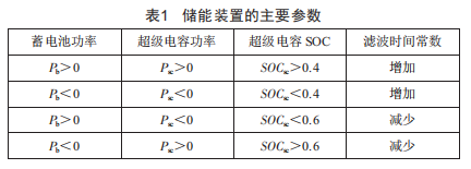 濾波時間常數(shù)的大小與延長蓄電池的循環(huán)壽命和儲能裝置間的能量轉移密切相關。調(diào)整濾波時間常數(shù)的大小時,需要考慮超級電容的荷電狀態(tài)。具體的參數(shù)調(diào)整方式如表1所示。