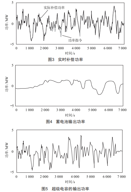 仿真中驗證基于超級電容aso的功率再分配方案的實時補償系統(tǒng)功率的情況、蓄電池補償?shù)皖l功率部分、超級電容補償高頻功率部分及超級電容aso變化趨勢。仿真結果如圖3~6所示。