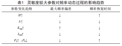 經(jīng)過對(duì)負(fù)荷模型所有參數(shù)進(jìn)行攝動(dòng)分析,感應(yīng)電動(dòng)機(jī)參數(shù)轉(zhuǎn)子的慣性時(shí)間常數(shù)H、a,電動(dòng)機(jī)負(fù)荷在總負(fù)荷中所占的比例Kpm以及擴(kuò)展ZIP模型參數(shù)PZ、PP、LDP等共計(jì)6個(gè)參數(shù)對(duì)頻率的靈敏度比較大:其余參數(shù)值對(duì)系統(tǒng)頻率的靈敏度比較小。靈敏參數(shù)對(duì)頻率特性影響情況如表1所示。