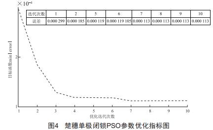 本次優(yōu)化算法故障擬合來(lái)源于云南異步聯(lián)網(wǎng)試驗(yàn)楚穗單極閉鎖)一次調(diào)頻死區(qū)均整定為±0.05Hz)實(shí)測(cè)數(shù)據(jù)。待優(yōu)化的粒子維度為6,即2丑、Kpm、A、PZ、PP、LDP6個(gè)參數(shù),仿真中更關(guān)注最大頻率偏差,n1=0.9。采用PsO優(yōu)化算法進(jìn)行搜索后,獲得最小誤差搜索曲線如圖4所示。