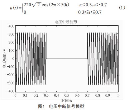 本文針對電壓中斷波形進行Mat1ab仿真實驗,電壓中斷波形如圖1所示,電壓有效值、頻率以及采樣頻率與電壓驟降波形相同,電壓在t=0.3s發(fā)生中斷,于t=0.7s時恢復,持續(xù)時間為0.4s,數(shù)學模型如式(1)所示: