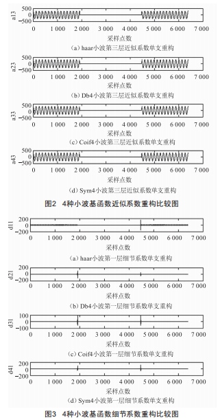 分別利用Haar小波、Db4小波、Coif4小波和sym4小波對其進行處理,分解尺度為3,得到分解后的小波系數(shù)如圖2、圖3所示。