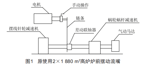 2×1880m3高爐爐前擺動流嘴主要由氣馬達(dá)、擺線針輪減速機(jī)、差動聯(lián)軸器、蝸輪蝸桿減速機(jī)、連桿及流槽等組成(圖1)。其操作方式有氣動和電動兩種,氣動操作主要是通過氣動馬達(dá)驅(qū)動擺線針輪減速機(jī)、差動聯(lián)軸器、蝸輪蝸桿減速機(jī)及連桿機(jī)構(gòu)運作從而操作擺動流槽,實現(xiàn)鐵水外放功用:電動操作主要是通過手輪控制電氣設(shè)備驅(qū)動與差動聯(lián)軸器連接的鏈條,帶動差動聯(lián)軸器、蝸輪蝸桿減速機(jī)及連桿機(jī)構(gòu)運行,實現(xiàn)操作擺動流槽。當(dāng)氣動裝置發(fā)生故障時,則使用手輪電控裝置進(jìn)行操作。