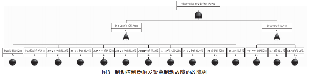 初因事件確定后,再對(duì)各安全環(huán)節(jié)進(jìn)行分析,以確定后續(xù)事件:(1)制動(dòng)控制器觸發(fā)緊急制動(dòng)故障:(2)緊急制動(dòng)按鈕觸發(fā)緊急制動(dòng)故障:(3)緊急制動(dòng)閥觸發(fā)緊急制動(dòng)故障。