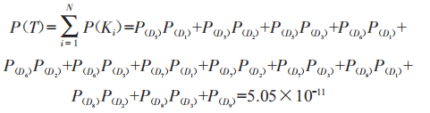 由于最小割集發(fā)生概率較低,兩個(gè)割集之間是相互獨(dú)立的,即兩個(gè)以上割集同時(shí)發(fā)生的情況忽略不計(jì)。參考《RMs型號(hào)可靠性維修性保障性技術(shù)規(guī)范》,頂事件T0發(fā)生的概率用下列公式計(jì)算: