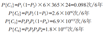 根據(jù)圖6的ETF分析圖,結(jié)合和諧型電力機(jī)車C5修修程周期(以先到為準(zhǔn))100×(1±10%)萬(wàn)km,不超過(guò)6年,假設(shè)部件運(yùn)行了6年時(shí)間,計(jì)算C1、C2C3和C4發(fā)生的概率: