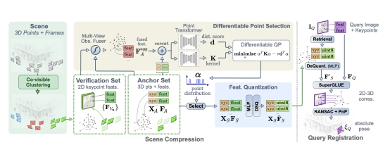 根據(jù)論文SceneSqueezer: Learning to Compress Scene for Camera Relocalization,達(dá)摩院團(tuán)隊(duì)采用分層策略對(duì)3D地圖進(jìn)行壓縮,首先利用成對(duì)的共可見性信息對(duì)數(shù)據(jù)庫圖像進(jìn)行聚類,將場景劃分為多個(gè)集群分別壓縮;其次,基于最終的位姿估計(jì)精度,學(xué)習(xí)選擇每個(gè)圖片的特征點(diǎn);最后通過特征量化方法壓縮特征點(diǎn)的描述。該算法在Cambridge Landmarks、Aachen Day-Night等室外場景數(shù)據(jù)集上取得了優(yōu)于既有方法的表現(xiàn)。