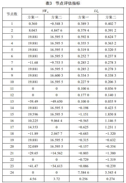 最后,本文從節(jié)點(diǎn)側(cè)視角,基于系統(tǒng)總投資成本(sw)、塞勒指數(shù)(LIn)評估了上述兩種方案,結(jié)果如表3所示,方案一的塞勒指數(shù)較低。