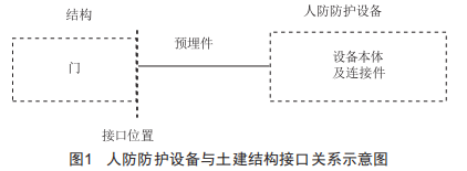 如圖1所示,在地鐵人防門與土建施工接口過程中,接口位置在防護設備門框墻處,人防門單位核實并提供結構預埋要求給土建施工單位,土建施工單位提供預埋條件,在門框墻施工前完成結構預埋,在預埋工序完成后,土建施工單位完成門框墻澆注。