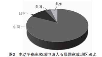 圖2反映了電動平衡車領域各國家或地區(qū)的申請人中所占比例,其中,我國申請人占82%,其次是日本、美國申請人,各占11%、3%。可見電動平衡車領域?qū)@纳暾埲酥黧w是中國申請人,其他國家或地區(qū)申請人的申請量較小。雖然電動平衡車的研發(fā)起源于美國,第一個平衡車品牌為美國的賽格威Segway),其電動平衡車的生產(chǎn)、設計歷史最久,但由于價格昂貴和安全性問題,據(jù)統(tǒng)計,2001一2007年賽格威總共只賣出3萬輛,并在2015年4月被小米公司收購。雖然賽格威的發(fā)展并不如預期,但這也給諸多平衡車生產(chǎn)企業(yè)提供了突破口。