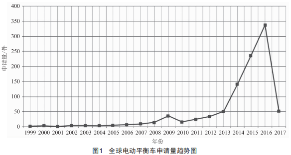本文旨在對電動平衡車領域的專利申請總量、申請年代分布、申請國家分布、技術分支和申請人分布等數(shù)據(jù)進行統(tǒng)計分析。通過統(tǒng)計分析,盡可能全面地反映出電動平衡車領域的專利技術發(fā)展過程及發(fā)展趨勢,為我國相關行業(yè)技術研發(fā)提供思路。