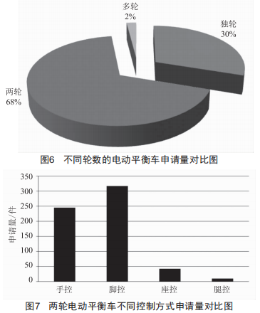 現(xiàn)有平衡車主要有獨輪的、兩輪的和多輪的(三輪、四輪及以上),如圖6所示,兩輪和獨輪的平衡車是應用最為廣泛的,多輪平衡車的安全性雖好,但便攜性和趣味性較差,其相關申請并不多。兩輪電動平衡車的操控方式主要有四種:手控型腳控型腿控型座控型。手控型多是車體上有一個操作桿,使用者通過手部對操作桿進行轉(zhuǎn)動或擺動操作,從而實現(xiàn)轉(zhuǎn)向:腳控型多屬于車體可分為左右兩個部分,左部分和右部分之間通過兩腳部動作不同而實現(xiàn)轉(zhuǎn)動控制:腿控型是在車體中部設置一個操作桿或在車體兩側(cè)設置兩個操作桿,該操作桿位于膝蓋上下的位置,使用者通過腿部轉(zhuǎn)動或擺動操作桿或接近7遠離操作桿(測距)實現(xiàn)車體轉(zhuǎn)向:座控型是在車體上設置一個座椅,通過座椅的左右轉(zhuǎn)動或擺動實現(xiàn)車體轉(zhuǎn)向。