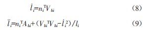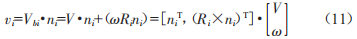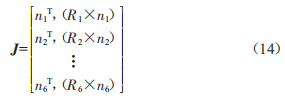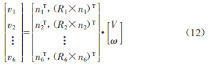 另一方面,由圖2可知,動平臺上的較鏈點的速度Vbi可由平臺的角速度o=(oX,oy,oZ)T和動平臺原點P的速度V=(VX,Vy,VZ)T求得: