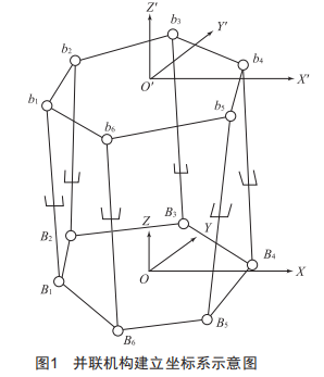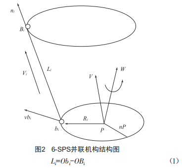 如圖1所示,上平臺建立動坐標系o'-x'y'Z',下平臺建立坐標系o-xyZ,定平臺的半徑為R,動平臺的半徑為r,定平臺到工作臺的距離為H,Zblo'b6=8b,ZBloB6=8B:6-sPs并聯(lián)機構(gòu)的結(jié)構(gòu)如圖2所示,以Li表示第i條支路兩較之間的矢量。