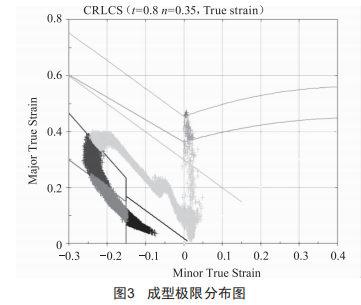 CAE分析結(jié)果如圖2、圖3所示,其中,圖2是成型形貌分布,可以直觀地看出裂紋可能的發(fā)展位置與趨勢(shì):圖3是成型極限的數(shù)值分布,可以顯示出具體的成型不良區(qū)域的數(shù)值大小。
