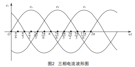 圖4為三相橋式整流電路的原理圖以及經(jīng)整流電路整流后輸出的電流波形圖。結(jié)合圖2,在周期