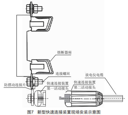 (2)新型快速連接裝置第二活動接頭直接通過線夾與放電儀電纜連接,兩者在同一水平線上,有效避免了放電儀放電線受到外力作用時(shí),快速連接裝置第二活動接頭逆旋轉(zhuǎn)導(dǎo)致接觸不良的隱患。