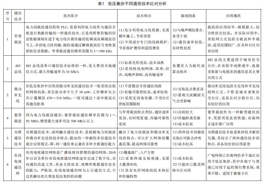 南方電網(wǎng)區(qū)域現(xiàn)行使用的低壓集抄通信技術(shù)包括窄帶載波、Rs-485、微功率無線、寬帶載波、雙模通信技術(shù)以及有線電視通信網(wǎng)等,各類通信技術(shù)特點比對分析如表1所示。
