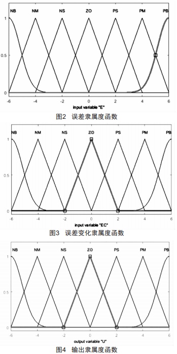 確定模糊控制器為單變量二維模糊控制器,定義輸入、輸出模糊集對(duì)誤差e、誤差變化ec及控制量u的模糊集及其論域,e、ec和u的模糊集均為:(NB,NM,NS,Z0,PS,PM,PB),e、ec、u的論域均為(-6,-4,-2,0,2,4,6)。在Mat1ab軟件中構(gòu)建如圖2所示的誤差隸屬度函數(shù),如圖3所示的誤差變化隸屬度函數(shù),如圖4所示的輸出隸屬度函數(shù)。