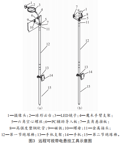 圖3(4)為桿塔號(hào)標(biāo)志牌遠(yuǎn)程可視帶電懸掛工具,該工具是與相框式上開結(jié)構(gòu)桿塔號(hào)標(biāo)志牌支架配套使用的。由于上開式標(biāo)志牌框架的內(nèi)部縫隙很小,內(nèi)部寬度只有10a1511,標(biāo)志牌安裝高度較高,懸掛有難度,因此通過(guò)在絕緣棒12的基礎(chǔ)上改良絕緣棒工作頭,并增加了攝像頭1和LED鏡子3,在帶電的情況下更換標(biāo)志牌,將標(biāo)志牌放在直角懸掛板~頂端的半圓形位置上,直角懸掛板~內(nèi)部嵌有磁鐵將標(biāo)志牌緊緊地吸住以防止其擺動(dòng),不僅可以利用LED鏡子光學(xué)反射原理檢查懸掛的情況,還可以利用手機(jī)1~與攝像頭1進(jìn)行wi一Fi遠(yuǎn)程實(shí)時(shí)連接,用手機(jī)觀察懸掛的情況,將標(biāo)志牌的底部靠近支架上部的縫隙位置,利用PC輔助導(dǎo)入板6將標(biāo)志牌拉入到支架的縫隙內(nèi)。圖3(b)為開關(guān)、刀閘及變壓器標(biāo)志牌遠(yuǎn)程可視帶電懸掛工具,原理和使用方法相同,只是減少了LED鏡子和PC輔助導(dǎo)入板。