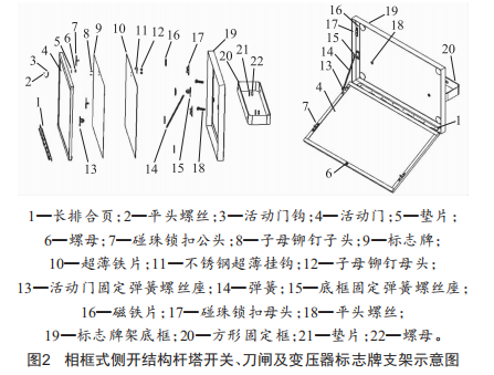 相框式側(cè)開結(jié)構(gòu)桿塔開關(guān)、刀閘及變壓器標(biāo)志牌支架如圖2所示。本支架是通過(guò)方形不銹鋼固定框20用螺絲或U形抱箍固定在桿塔上,開關(guān)標(biāo)志牌、跌落式熔斷器標(biāo)志牌及刀閘標(biāo)志牌的安裝高度為距地面~.51以上。標(biāo)志牌9安裝懸掛的時(shí)候,首先將絕緣懸掛工具的工作頭扣住標(biāo)志牌活動(dòng)門的掛鉤3向反方向拉開活動(dòng)門~,然后利用懸掛工具將標(biāo)志牌放進(jìn)標(biāo)志牌支架內(nèi)框,此時(shí)支架內(nèi)框四個(gè)邊的磁鐵迅速地吸引標(biāo)志牌背面鐵片,會(huì)將標(biāo)志牌自動(dòng)定位吸引住不讓其向下跌落,再用懸掛工具將活動(dòng)門鉤往上推關(guān)閉活動(dòng)門,活動(dòng)門上的兩邊的鎖扣會(huì)緊緊地鎖住標(biāo)志牌支架。