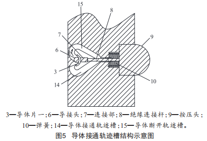 具體實現(xiàn)短接的過程如下:未按下按壓頭9時,導(dǎo)接頭6的初始位置(如圖4所示位置)位于導(dǎo)接塊5運(yùn)行軌跡槽的上端,且偏向?qū)w接通軌跡槽14的一側(cè):在短接時,選擇其中兩個導(dǎo)體柱2與繼電器觸點(diǎn)連接后,需要將導(dǎo)體片一3和導(dǎo)體片二4接通,向下按壓按壓頭9,導(dǎo)接頭6會沿著導(dǎo)體接通軌跡槽14移動(如圖4中箭頭a的方向)直到到達(dá)導(dǎo)接塊5運(yùn)行軌跡槽的下端(導(dǎo)體接通軌跡槽14和導(dǎo)體斷開軌跡槽15的相接處,如圖5所示位置),且偏向?qū)w斷開軌跡槽15的一側(cè),此時導(dǎo)體片一3和導(dǎo)體片二4通過導(dǎo)接頭6電連接:當(dāng)需要將導(dǎo)體片一3和導(dǎo)體片二4斷開時,再次按壓按壓頭9,導(dǎo)接頭6會沿著導(dǎo)體斷開軌跡槽15移動(如圖5中箭頭b的方向)直到到達(dá)導(dǎo)接塊5運(yùn)行軌跡槽的上端(回到初始位置),此時導(dǎo)體片一3和導(dǎo)體片二4由于沒有導(dǎo)接頭6的電連接作用斷開連接。