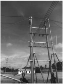 筆者于2019年10月21日在湛江吳川市110kVxx站10kVxx線10#塔至13#桿進(jìn)行更換導(dǎo)線工作。110kVxx站10kVxx線10#塔至13#桿架空導(dǎo)線為LGJ-95/40裸導(dǎo)線,長度150m。該線路運(yùn)行多年,鄰近學(xué)校,經(jīng)常受風(fēng)箏等飄掛物影響,且與城市綠化走廊重疊,樹木生長嚴(yán)重影響線路運(yùn)行安全。一旦線路跳閘,將影響xx個專變戶客戶和6臺公變(約1300個低壓客戶)。為進(jìn)一步提高居民用電可靠性,緩解電力線路與運(yùn)行環(huán)境矛盾,決定將該段架空導(dǎo)線改造為JKLYJ-120架空絕緣導(dǎo)線。但現(xiàn)場勘察,在放線過程中有兩處帶電的低壓導(dǎo)線需要跨越,經(jīng)目測,帶電的低壓導(dǎo)線高度約4.5m,為保障放線時人身安全,防止新展放絕緣導(dǎo)線與帶電低壓導(dǎo)線發(fā)生摩擦造成安全隱患,筆者決定使用新型絕緣跨越支架進(jìn)行作業(yè),全過程安全高效(圖1)。