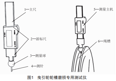 (3)曳引輪輪槽磨損專用測試儀。其結構如圖1所示,組成主要包括主尺1、游標尺2、測量球3、測針4,同時配備5種規(guī)格專用調整球各1個,直徑分別為8mm、10mm、12mm、13mm、16mm。其測量方法為:儀器經(jīng)過精密校準后,將測量球3放在繩槽6內,下壓主尺1,使測針4碰觸繩槽6底部,此時測量數(shù)據(jù)在主尺1上的游標尺2讀取。主尺1與測針4相連,從測量球3中間孔穿過。曳引輪輪槽磨損專用測試儀中主尺1、游標尺2與測針4為一體化設計,集成于主尺1上,測量球3為中間有孔的半球形金屬裝置。該測試儀測量精度可達0.01mm,測量靈敏度及精度高。
