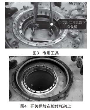 對(duì)主變壓器有載開關(guān)進(jìn)行吊檢,用如圖3所示專用工具將開關(guān)器室與本體分離,下放到開關(guān)器室的檢修托架上,如圖4所示。