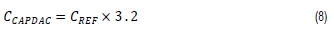 設(shè)計(jì)AD7746時(shí),保證滿(mǎn)量程CAPDAC電容(CCAPDAC)與內(nèi)部基準(zhǔn)電容之間的比值為3.2。所以,CAPDAC的滿(mǎn)量程可以使用公式8計(jì)算得出: