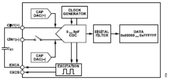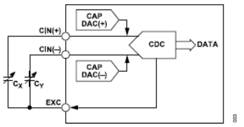 。將一個(gè)方波激勵(lì)信號(hào)施加到CXn的一端,調(diào)制器連續(xù)地對(duì)通過(guò)相應(yīng)CINn引腳的電荷進(jìn)行采樣。調(diào)制器輸出經(jīng)過(guò)數(shù)字濾波器處理、按比例縮放,并應(yīng)用工廠(chǎng)校準(zhǔn)系數(shù),最終結(jié)果通過(guò)串行接口讀出。