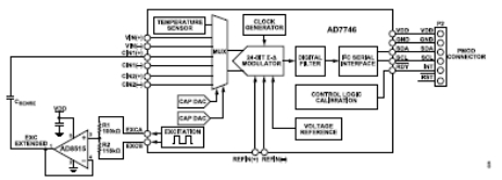 圖1所示的電路的核心為AD7746,是一款24位Σ-Δ電容數(shù)字轉(zhuǎn)換器(CDC),具有I2C串行通信接口,提供高分辨率(24位無(wú)失碼,最高21位有效分辨率)、高線(xiàn)性度(±0.01 %)和高精度(±4 fF工廠(chǎng)校準(zhǔn))電容測(cè)量。它包含一個(gè)二階調(diào)制器和一個(gè)三階數(shù)字濾波器