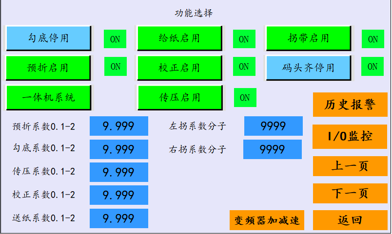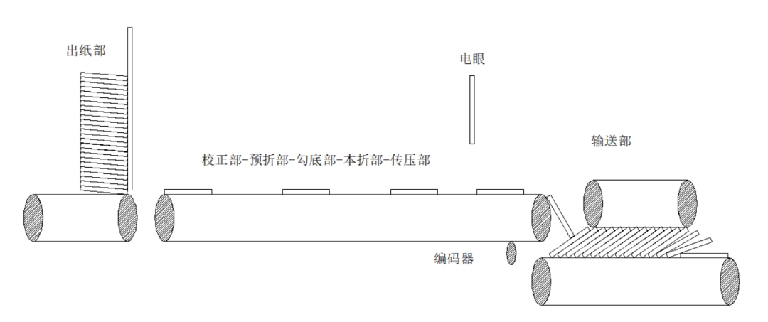 輸送變頻配合出料電眼,限高電眼,編碼器,控制出料輸送帶速度、啟停,達(dá)到出料呈魚(yú)鱗狀排布效果,其他的變頻實(shí)現(xiàn)產(chǎn)品的給紙、校正、預(yù)折、勾底、本折、傳壓等動(dòng)作。