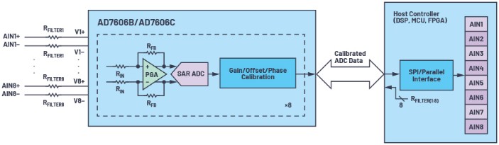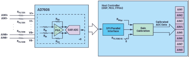AD7606B和AD7606C提供片內(nèi)增益校準功能,在創(chuàng)建高精度數(shù)據(jù)采集系統(tǒng)時更具優(yōu)勢。1 無需消耗主機控制器的資源,也無需在出廠測試期間執(zhí)行任何測量,即可輕松使用和實現(xiàn)最低的系統(tǒng)增益誤差。每個通道有一個寄存器,您可以將RFILTER值寫入該寄存器,ADC之后有一個數(shù)字模塊,會以數(shù)字方式補償這個電阻增加的誤差。這個用戶可編程的數(shù)字模塊可以補償增益、失調(diào)和相位誤差,本文只介紹增益誤差。這個片內(nèi)增益校準模塊可以獲知準確的輸入阻抗(RIN),所以它始終比后端校準更精準,與實際的RIN和RFILTER值無關(guān)。