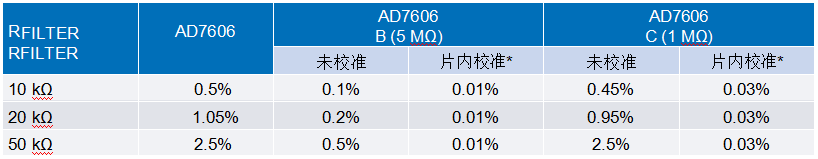總之,外部前端電阻(RFILTER)導(dǎo)致的增益誤差和片內(nèi)校準功能的精度都取決于輸入電阻(RIN),在每個器件內(nèi)部該值都是已知的。對這三個類型,如果不進行校準,那么增益誤差隨RFILTER呈線性變化,表2顯示在3個給定的RFILTER值下,三個類型之間的比較,以及它們?nèi)绾瓮耆皇苓@些電阻值影響。