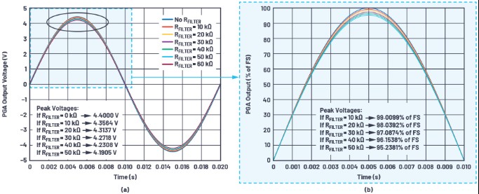 (a) 顯示PGA輸出(單位:V),(b) 顯示PGA輸出電壓(FS的百分比)。