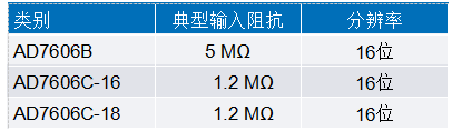 在AD7606B項目開發(fā)期間,指定的三款產(chǎn)品的輸入阻抗和分辨率如表1所示。