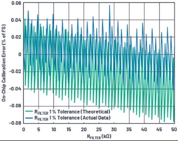 這個8位寄存器表示RFILTER整數(shù)變量,可以對高達64 kΩ的電阻實施補償,分辨率為1024 Ω。因為這種離散分辨率,如果RFILTER不是1024的倍數(shù),會產(chǎn)生舍入誤差。圖12中的圖表顯示后校準誤差如何保持在±0.05%以下,不受RFILTER和RIN影響(在計算校準系數(shù)(K)時會使用這兩個值),不假設(shè)RIN等于其典型值,而是使用內(nèi)部實際測量得出的RIN值。如果與圖10相比,以RFILTER = 30 kΩ為例,這意味著誤差降低高達10倍。這個誤差與RFILTER完全無關(guān),RFILTER越大,誤差降低的幅度越大。