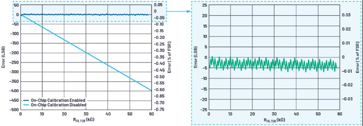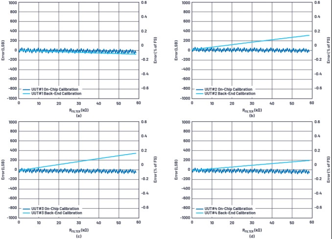? 片內(nèi)校準(在所有4個圖中,以深藍色顯示)保持所有裝置和RFILTER值的總誤差均低于0.03%。
