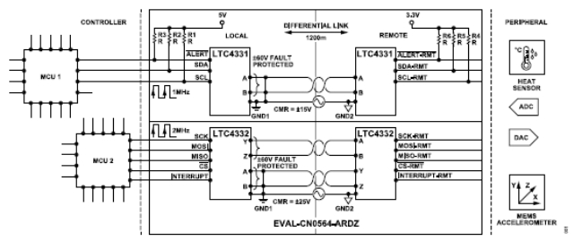 CN0564使用LTC4331和LTC4332來擴(kuò)展I2C和SPI信號(hào),距離最長可達(dá)1200米。每個(gè)鏈路由一對器件組成,控制器側(cè)配置為本地模式(REMOTE引腳接低電平),外設(shè)側(cè)器件配置為遠(yuǎn)程模式(REMOTE引腳接高電平)。