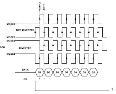 時(shí)鐘和數(shù)據(jù)之間支持四種不同的時(shí)序關(guān)系,分別稱為模式0、1、2、3,對應(yīng)于四種可能的時(shí)鐘配置。每個(gè)事務(wù)都是在片選線被驅(qū)動(dòng)到邏輯低電平時(shí)開始(片選通常是低電平有效信號(hào))。片選、數(shù)據(jù)和時(shí)鐘線之間的確切關(guān)系取決于時(shí)鐘極性(CPOL)和時(shí)鐘相位(CPHA)的配置。這四種模式總結(jié)在圖2中。
