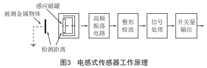 在產(chǎn)品分揀控制系統(tǒng)中,當有金屬物塊靠近傳感器的振蕩感應(yīng)頭時,金屬物塊會在內(nèi)部生成渦流,而渦流會對傳感器產(chǎn)生影響,減弱其振蕩能力,就會使該電感式傳感器內(nèi)部發(fā)生變化,傳感器就可以由此識別出金屬物塊,來控制開關(guān)是否啟動。電感式傳感器工作原理如圖3所示。