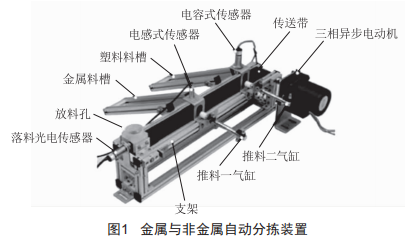 該系統(tǒng)為金屬與非金屬自動分揀裝置,如圖1所示。當有物塊進入時,入口光電傳感器會檢測到信號,且馬上給輸送帶電動機傳遞啟動信號。當物塊被輸送到推桿一位置時,如該物塊為金屬,會觸發(fā)電感式傳感器,此時氣缸會接收到信號產(chǎn)生動作,將物塊推入金屬物塊對應(yīng)的收集槽內(nèi):如該物塊為非金屬,當該物塊被輸送到推桿二位置時,會觸發(fā)電容式傳感器,此時氣缸會接收到信號產(chǎn)生動作,將物塊推入非金屬物塊對應(yīng)的收集槽內(nèi)。