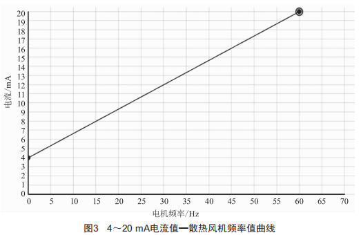 最后,變頻器將接收到的4~20mA電流信號作為變頻器的控制輸入信號,對應(yīng)控制散熱風機電源頻率在0~60Hz范圍內(nèi)變動,從而實現(xiàn)散熱風機的轉(zhuǎn)速從0到100%隨機組水溫變化而變化,其信號曲線圖如圖3所示。
